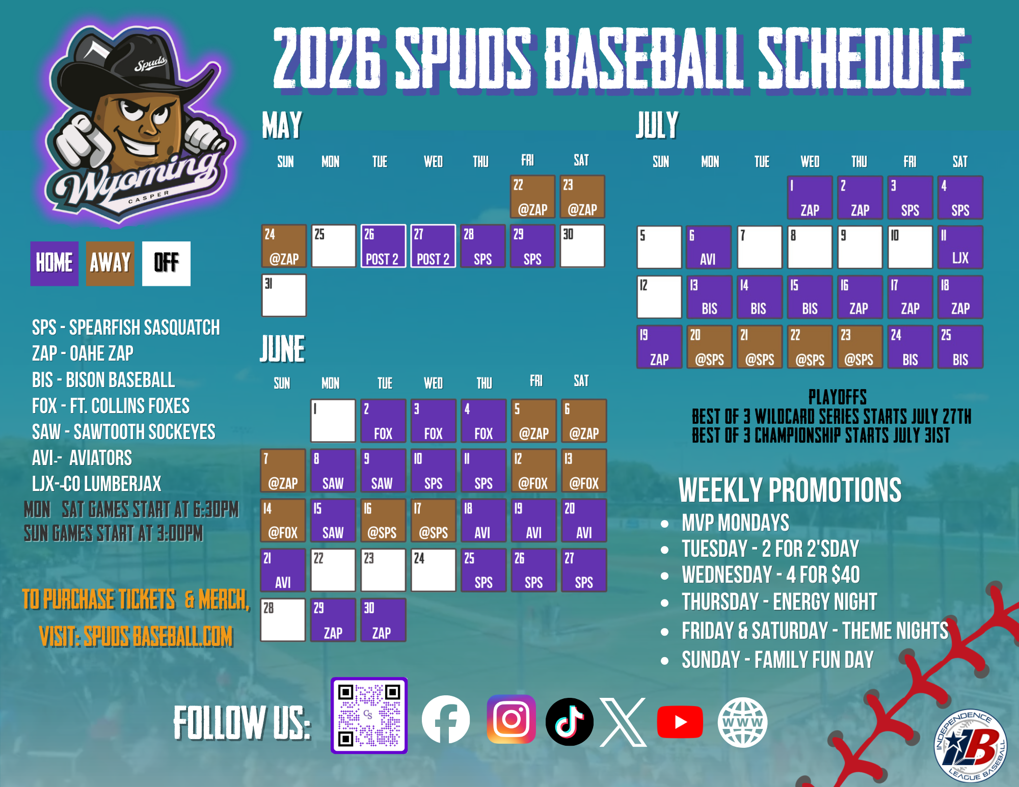 The 2026 Casper Spuds Baseball Season is now upon us. Please have a look below for our baseball schedule. You can purchase game day and season tickets at tickets.spudsbaseball.com
